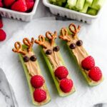 For holiday parties, I like arranging the celery reindeer upright in a shallow tray filled with a layer of ranch or cream cheese dip to hold them in place. Kids enjoy “feeding” the reindeer by pulling pretzel antlers and nibbling the noses last. You can also line them up on a festive platter to create a whole herd ready to snack on!