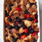 - Assemble the Casserole: Transfer the soaked bread and custard mixture into a greased baking dish. Evenly sprinkle the streusel topping over the surface, then scatter the berries on top.