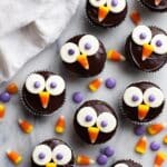 - Frost & Assemble Cupcakes: Work with 1-2 cupcakes at a time. Dip each cupcake into ganache or frost generously with chocolate frosting. Quickly place two prepared cookie eyes centered on top of each cupcake and hold them in place for 10-20 seconds; if needed, secure between two glasses to help them stick. Add a candy corn below the eyes to create the owl’s beak. Repeat for all cupcakes.