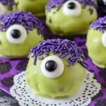 Before the coating sets, press one large candy eye into the front and scatter purple sprinkles on top as “hair.” Let these guys set completely at room temperature or pop them in the fridge briefly.