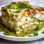 Lasagna al Pesto is a rich and creamy Italian dish that layers tender lasagna noodles with a fragrant basil pesto bechamel sauce, ricotta mixture, and melted mozzarella and Parmesan cheeses. This comforting vegetarian lasagna combines three cheeses with a homemade pesto-infused white sauce, perfect for cozy dinners and winter meals.