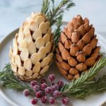 - Attach Almonds: Insert the toasted whole almonds into one pinecone and the toasted sliced almonds into the other pinecone. Place the nuts at a slight angle and in horizontal rows to mimic pinecone scales, pressing them gently into the cheese mixture so they hold securely.