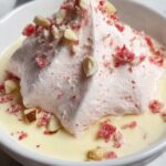 Ile Flottante With Pink Praline is a classic French dessert featuring light and airy floating meringue islands served atop a smooth vanilla crème Anglaise custard, garnished with crunchy pink praline for a delightful contrast of textures and flavors. This elegant dessert is perfect for impressing guests or enjoying a sophisticated treat at home.
