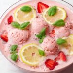 When you’re ready to serve, gently float the remaining sherbet scoops on top along with sliced strawberries, lemon slices, and a few basil leaves. It’s a beautiful presentation and instantly invites everyone to dig in. Set out 9-ounce cups or mason jars and let your guests help themselves—this punch always sparks a little excitement!