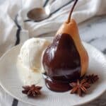 Plate each pear half or whole pear on a dessert plate, drizzle generously with the warm chocolate sauce, and add a scoop of vanilla ice cream. The contrast between warm pear, silky sauce, and cold ice cream is honestly one of my favorite dessert experiences. Serve immediately for best results.