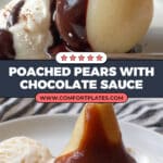 Plate each pear half or whole pear on a dessert plate, drizzle generously with the warm chocolate sauce, and add a scoop of vanilla ice cream. The contrast between warm pear, silky sauce, and cold ice cream is honestly one of my favorite dessert experiences. Serve immediately for best results.
