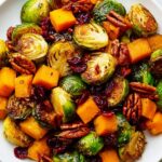 A vibrant and flavorful Thanksgiving side dish featuring roasted Brussels sprouts and cinnamon-spiced butternut squash tossed with toasted pecans and dried cranberries. This recipe combines sweet, savory, and nutty flavors for a perfect holiday accompaniment.