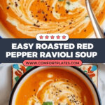 A comforting and flavorful Roasted Red Pepper Ravioli Soup featuring roasted vegetables blended into a smooth base, simmered with stock and tender ravioli, finished with a creamy drizzle, fresh basil, and optional red pepper flakes for a touch of heat.