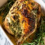 Basting is optional but recommended for extra moist and flavorful meat. If you’re short on time, don’t worry—the initial high heat roast and the butter under the skin do most of the work, so it will still turn out great.
