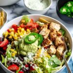 Mash the avocado with a pinch of salt and some chopped cilantro to create a simple, fresh guacamole. It’s creamy and cool, a perfect foil to the spicier components. Next, place all your vinaigrette ingredients—including lime juice, chipotle peppers in adobo, olive oil, honey, garlic, oregano, cilantro, salt, vinegar, and water—into a blender or food processor. Pulse until smooth, adding water to thin the dressing so it pours nicely. This dressing is the real star here—it brings smoky, sweet, and tangy notes that you’ll definitely want to keep extra handy.