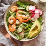 - Add the shrimp and dressing: Place the cooked shrimp over the arranged vegetables. Serve immediately with a generous drizzle of Green Goddess dressing to enhance the fresh flavors.