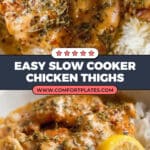 - These Slow Cooker Chicken Thighs cook low and slow in a garlic butter sauce until perfectly juicy, tender, and flavorful.