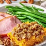 Make sure you bake the casserole uncovered so the topping crisps up in the oven. Also, avoid covering leftovers tightly until completely cooled to preserve that crunch. Toasting the pecans beforehand can also help maintain their texture.