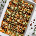 Once out of the oven, drizzle spicy mayo and unagi sauce over the top – I usually eyeball about 1/2 cup of spicy mayo and 1/4 cup unagi sauce. If you want, garnish with chopped cucumber, a sprinkle more of furikake, and green onion for color and crunch. Serve it family-style with a big spoon – everyone loves digging in!