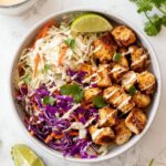 While the fish is cooking, toss your slaw mix with half a tablespoon of olive oil, the juice from the remaining half lime, and half a teaspoon of kosher salt. The lime brightens up the slaw and the salt enhances the natural sweetness of the cabbage—this balance keeps the bowl light and fresh.