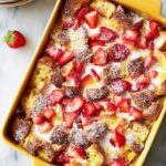 - Serve: Serve the baked French toast immediately, topped with the remaining diced strawberries and a dusting of confectioners’ sugar for a sweet, fresh finish.