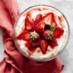 - Assemble the Trifle: In a large transparent trifle bowl or individual serving glasses, start by layering a portion of angel food cake cubes. Spoon a layer of the cooled strawberry sauce over the cake, then add a layer of the yogurt whipped cream. Repeat the layers until ingredients are used, finishing with a topping of fresh strawberries reserved from the initial 4 cups.