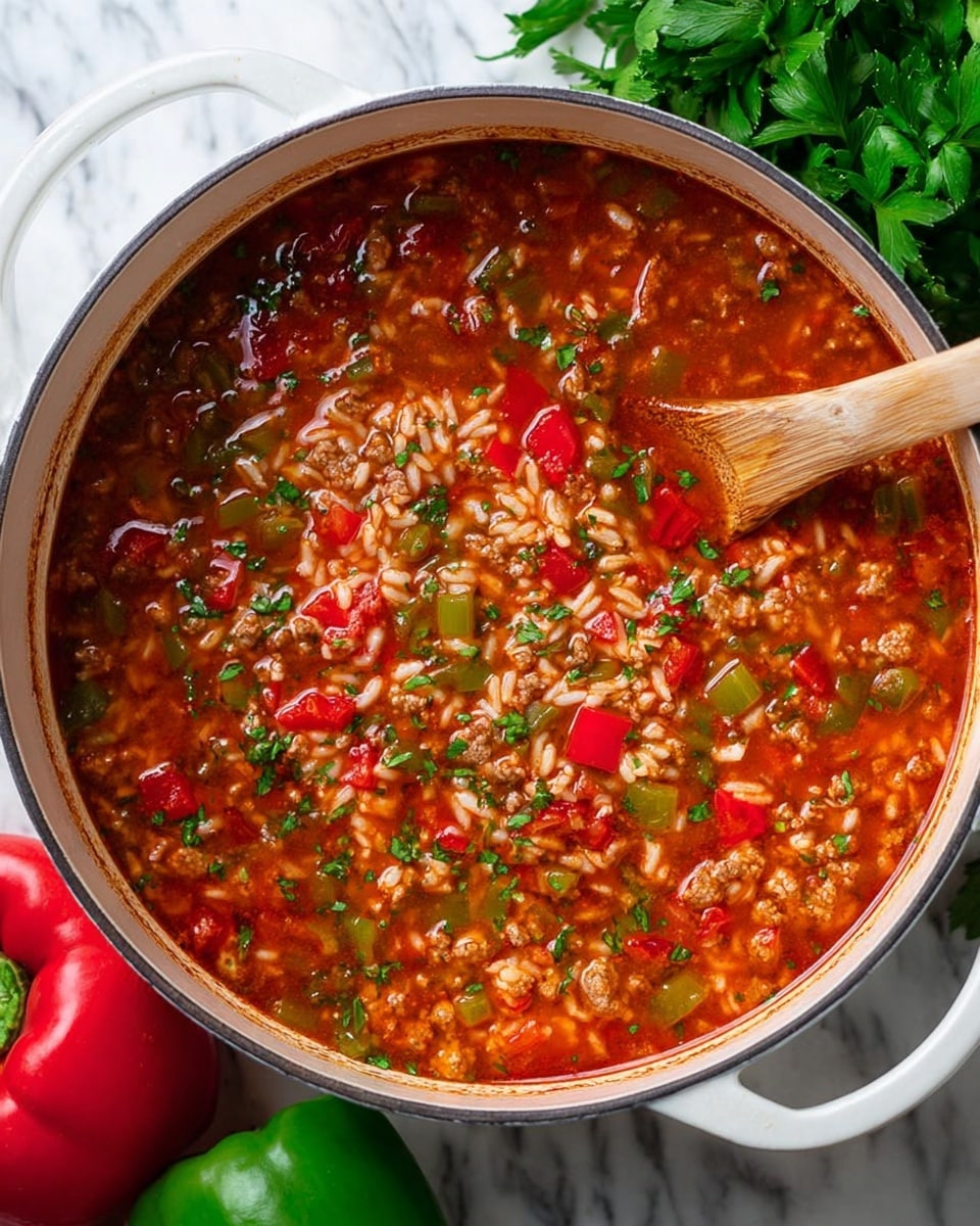 A comforting and hearty stuffed pepper soup featuring lean ground beef, fresh bell peppers, tomatoes, and herbs, simmered to perfection and optionally topped with cheese. This soup combines the classic flavors of stuffed peppers into a warm, bowl-ready meal perfect for cozy dinners.