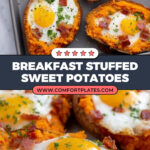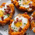 This Breakfast Sweet Potato recipe is a hearty and delicious way to start your day, featuring baked sweet potatoes filled with a savory mixture of bacon, butter, cheese, and eggs. Finished with a pop of fresh scallion, this dish combines creamy, smoky, and savory flavors with the natural sweetness of the potatoes for a satisfying breakfast or brunch option.