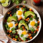 A vibrant and nutritious Sweet Potato Hash featuring tender sweet potatoes, sautéed poblano peppers, kale, and perfectly cooked eggs. This versatile dish is ideal for breakfast, lunch, or dinner, enhanced with creamy avocado, fresh cilantro, hot sauce, and lime wedges for a burst of flavor.