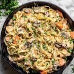 This particular Turkey Tetrazzini Recipe is made on the stovetop and served immediately for a creamy, fresh result. However, you can transfer it to a baking dish, top with cheese and breadcrumbs, and bake for about 20 minutes for a golden crust if desired.