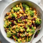This Vegan Curried Broccoli Chickpea Salad is a vibrant, nutritious, and flavorful dish combining finely chopped broccoli, shredded carrots, chickpeas, almonds, cranberries, green onions, and fresh cilantro, all tossed in a creamy, tangy curried tahini dressing. Perfect as a light lunch, side salad, or potluck dish, it offers a delightful mix of textures and a balance of sweet, tangy, and savory notes.