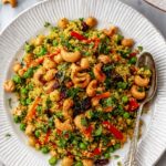 This Vibrant Curry Cashew Chickpea Quinoa Salad is a flavorful and nutritious dish combining fluffy quinoa, protein-rich chickpeas, and a medley of fresh vegetables, all tossed in a spicy curry blend. Toasted maple cayenne cashews add a delightful crunch and a touch of sweetness, making this salad perfect as a main dish or a flavorful side.