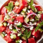 Place the watermelon, feta, cucumber, mint, and red onion in a large bowl. Pour the dressing over and gently toss everything until it’s well coated. Be careful not to mash the watermelon; use a light hand, and you’ll get that beautiful mix of juicy sweetness and savory bites in every forkful.