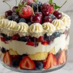 - Garnish and Chill: Pipe or dollop the vanilla whipped cream around the edge of the trifle. Garnish the top with the reserved fruits and berries. Chill the trifle for several hours before serving to allow flavors to meld and the dessert to set.